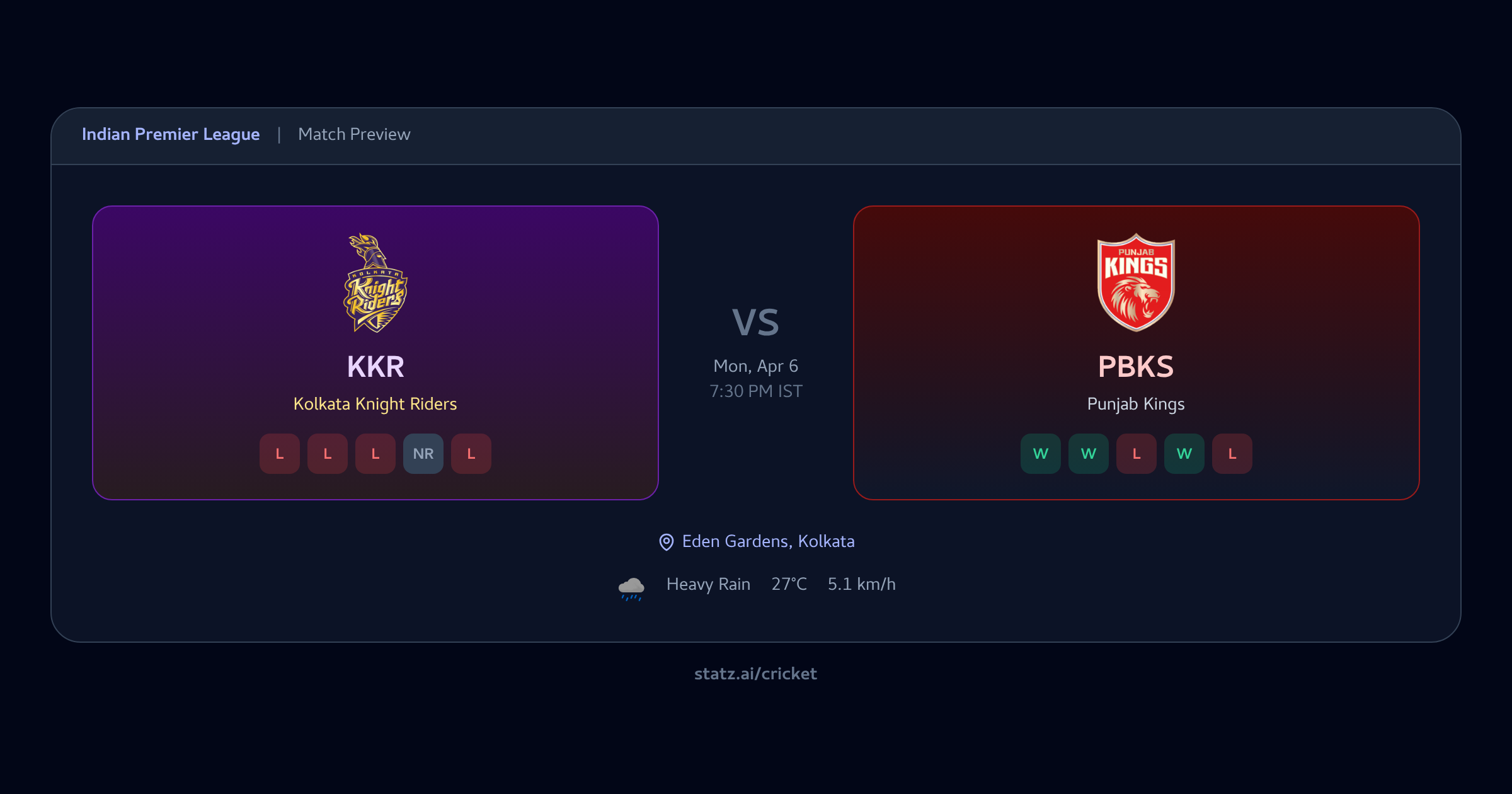 Last 5 H2H Results (KKR perspective)